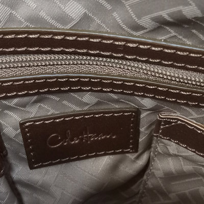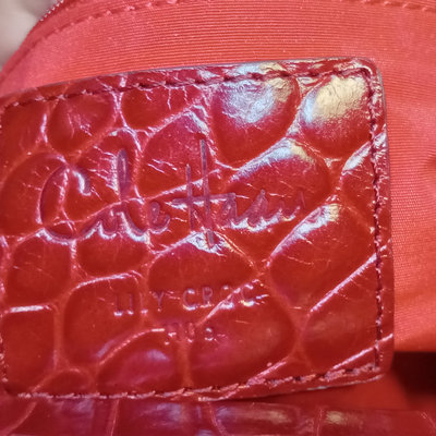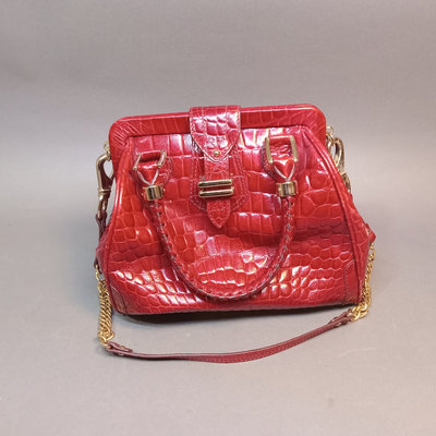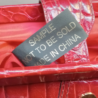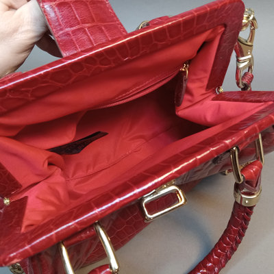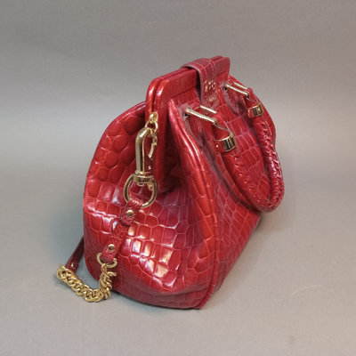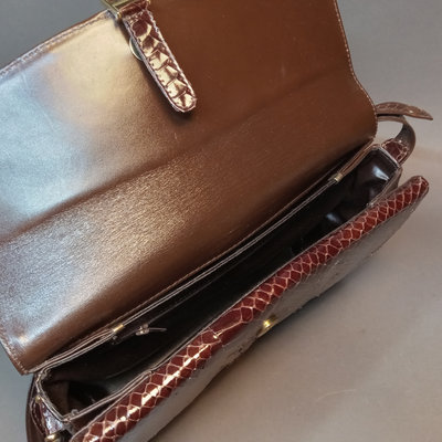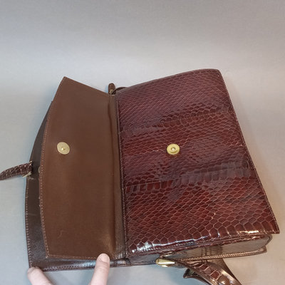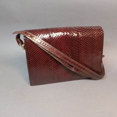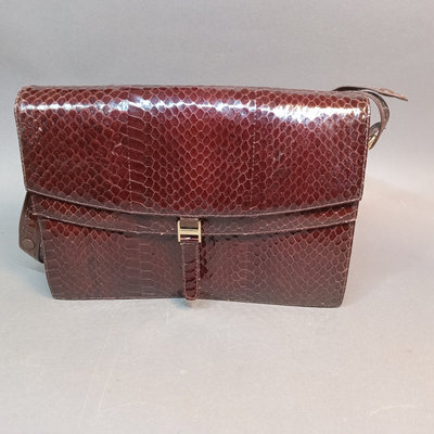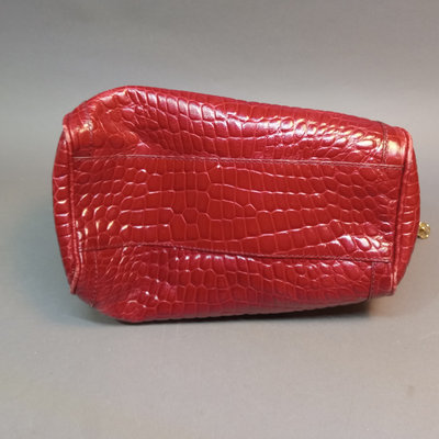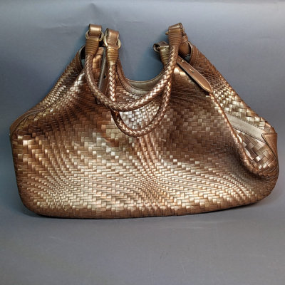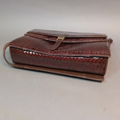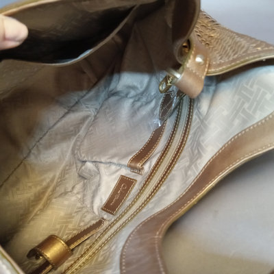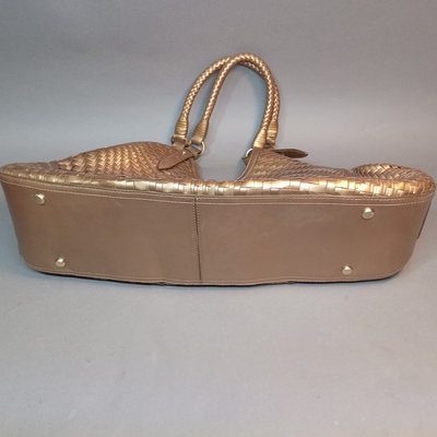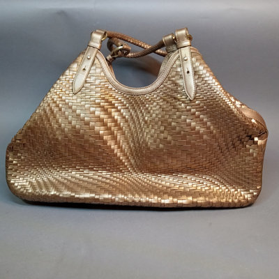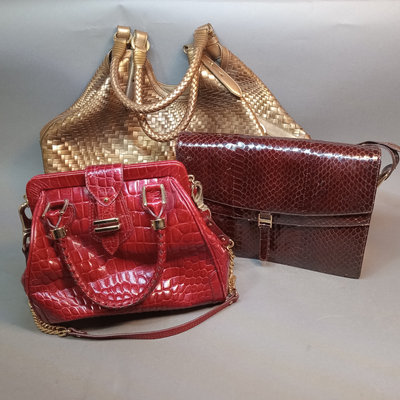 Cole Haan Genevieve weave gold leather large triangle tote, 19x6x14. Cole Haan crocodile style leather handbag, sample, made in China, 10x6x8. Unmarked vintage leather Snakeskin print bag, possibly a sample, interior zipper is tight, never used, 11x3x8. 3 pieces.