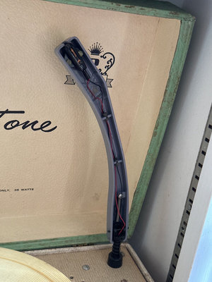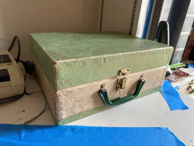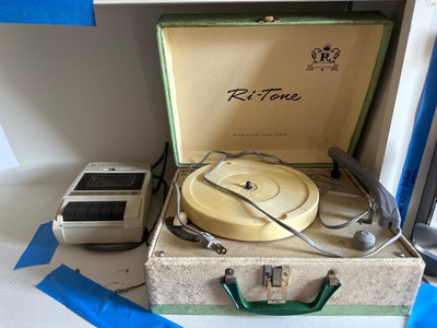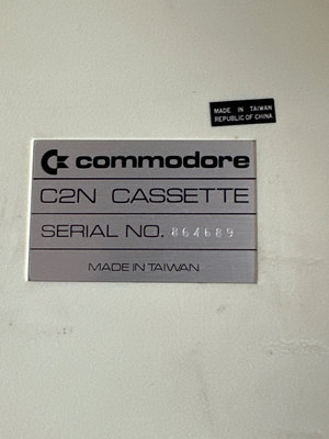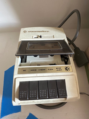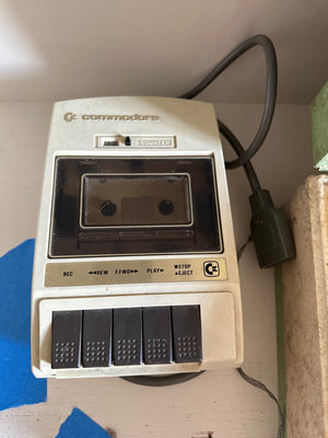 A collection of vintage electronics including a Commodore C2N cassette deck, a green textured portable turntable in a carrying case.