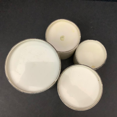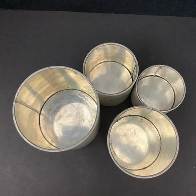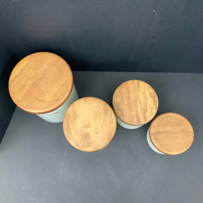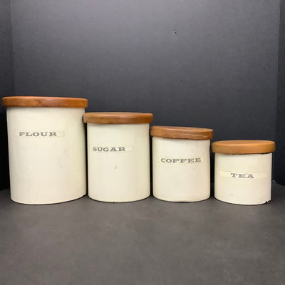 Set of 4 metal Copco kitchen containers with wood lids, wear and tear with age, still air tight, flour, 8.5h, sugar 6.75h, coffee 5.5h, and tea 4.25h. 4 pieces.