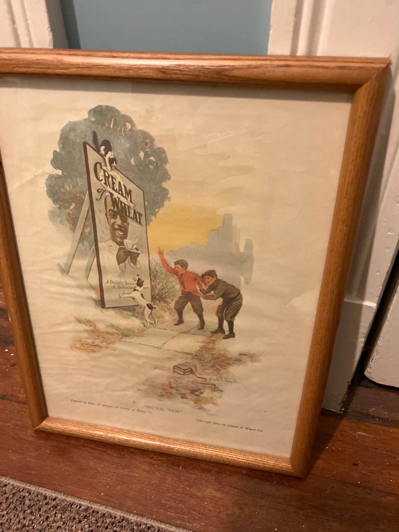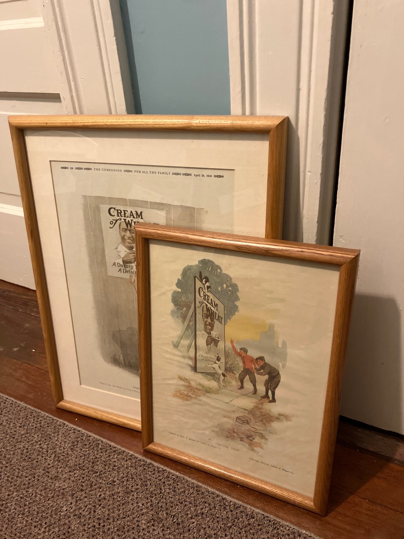 Two vintage framed illustrations advertising Cream of Wheat cereal from the early 20th century. O