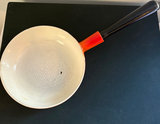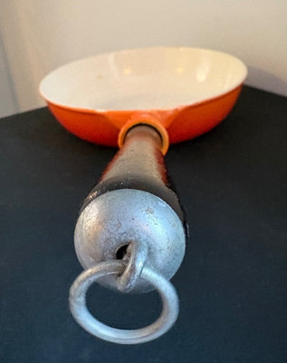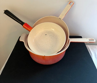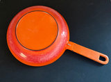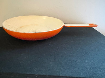 Descoware made enameled cast iron skillets , In Belgium , from the 1940s to the 1970s. This brand is known for its vibrant colors, such as these flame orange" seen in the image, and lighter weight than competing brands of cast iron cookware. • Legacy: The brand was eventually acquired by Le Creuset, another prominent enameled cast iron manufacturer. It remains a sought-after7”, 8” and 9” skillets , without covers .