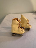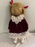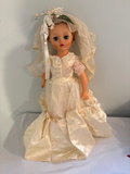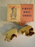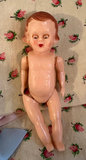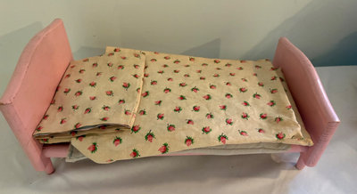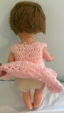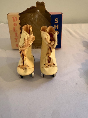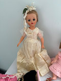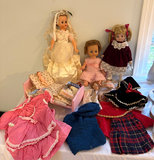 1950s or 60s doll in bride’s dress, beautiful blue sleep eyes , underskirts , tule, veil and flower headpiece and white sandal heels. Has moveable parts and stands 17”tall. Vintage Uneeda baby doll. The Uneeda Doll Company, founded in 1917, has a long history of doll making and manufactured many dolls in Hong Kong during the 1960s and later decades. This one has blue sleepy eyes, real lashes, not painted on, open mouth, diaper under crocheted dress and moveable parts. Brinn’s porcelain doll, 1989, named Virginia . 3” celluloid doll with sleep The small vintage doll in the image was likely manufactured between the 1930s and the 1960s.These types of small, jointed dolls were mass-produced from celluloid or hard plastic during this period. The last “sad” doll can only be used for parts . Dolls clothes include dress outfits with bonnet and underpants a handmade knit cape , a tartan skirt outfit with overcoat, pairs of shoes , a pair of roller skates and a doll’s bed.