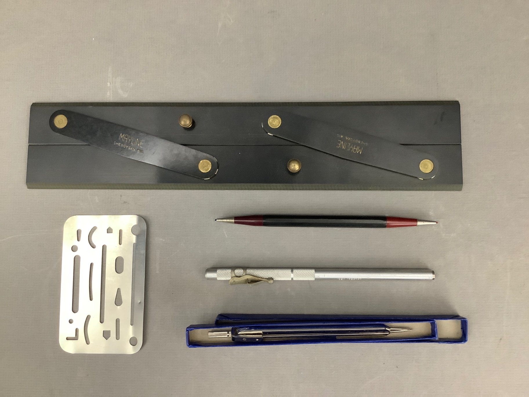Engineer Lensatic directional compass, made in Taiwan. Wood box X-acto blades and knives. Mayline drafting straight edge. Post Truemaster protractor set. Cutiecut nautical miles compass, and more. 10 pieces.