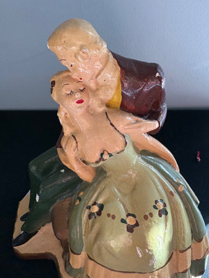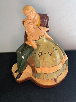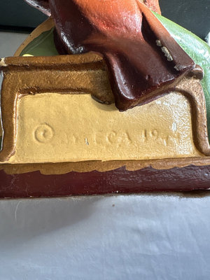 The company known as ECA, Chicago IL , was established in 1942 producing hand painted figurines and toys . This one of a couple is dated 1944 on the back. It has some chips as seen in the pictures . It is 5” wide, 6” tall