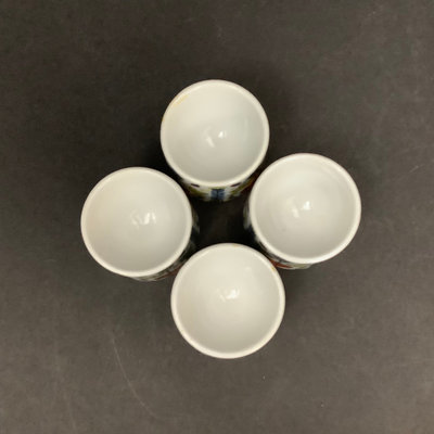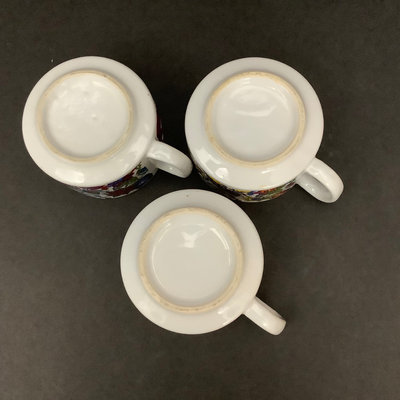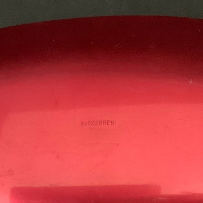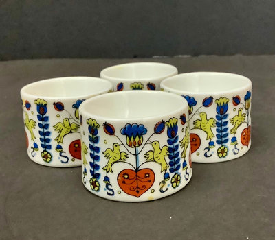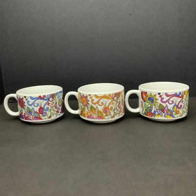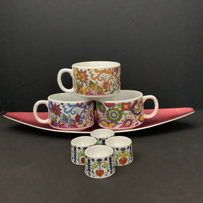 Eloxsoren boat shaped enamelware dish, minor scuffs from use and storage, 17.5x6.25. Unmarked mod paisley soup mugs 4.25dx3h and matching egg cups, small chip on rim of one, 1.5h. 8 pieces.