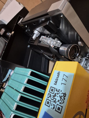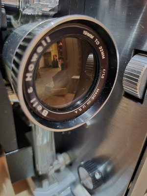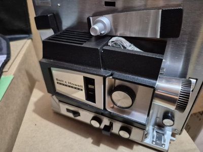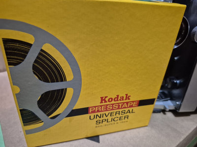 A collection of vintage film equipment consisting of a Bell & Howell projector, a Kodak Presstape universal splicer, and assorted film hardware and accessories. NO FILM INCLUDED. UNTESTED, as is as found. ** BRING OWN PACKING MATERIALS