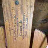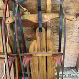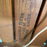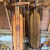 Vintage wooden sleds with steel runners and branded planks, including one Flexible Flyer sled. 2 sleds in total. Located in garage.
