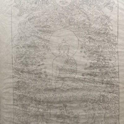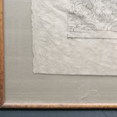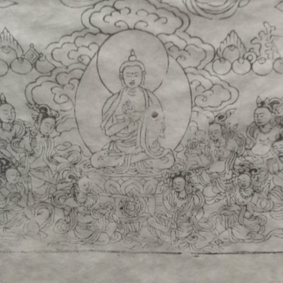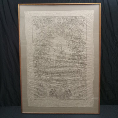 Buddha with his Assembly, original woodcut on rice paper, made in Tibet. Art 32x22, frame 36.5x26.5. 1 piece.