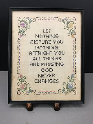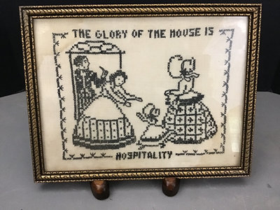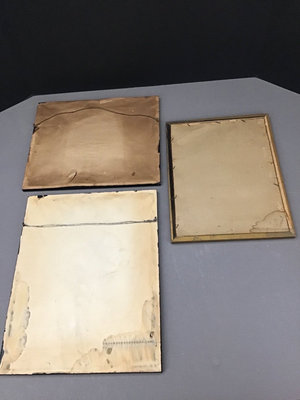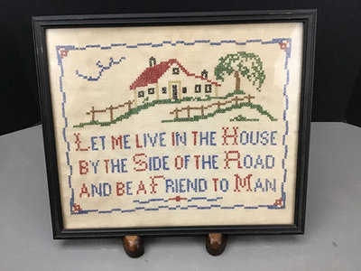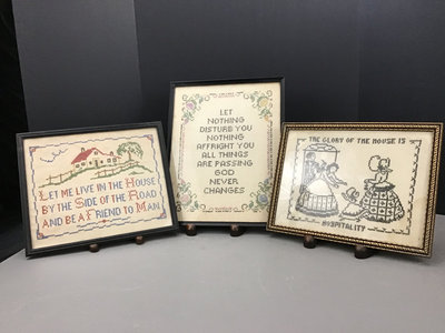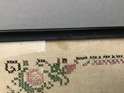 Portrait sampler, 14.5x11.5, spots on left side. House sampler 12.5x10.5. Gold framed sampler 13x 10, stains in opposite corners. 3 pieces.
