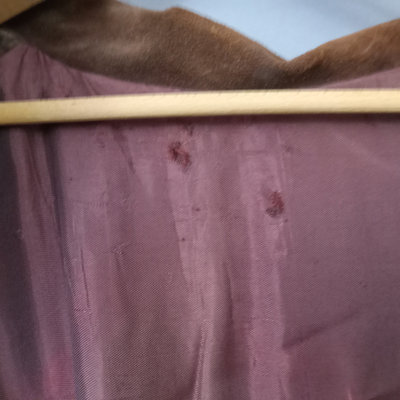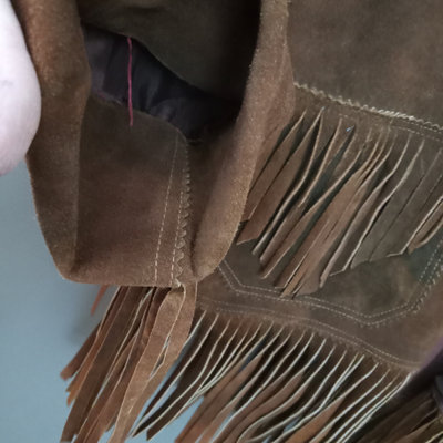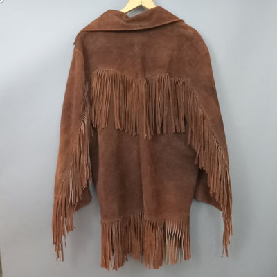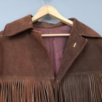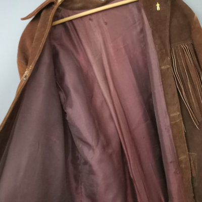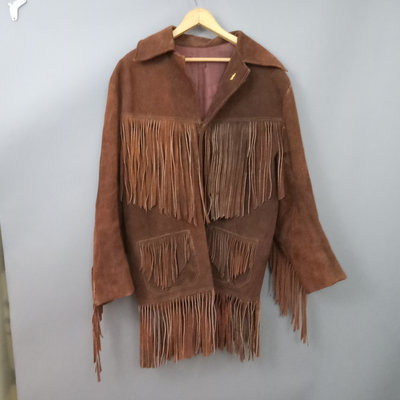 Vintage suede jacket with fringe, no tags. Lining, with several moth holes, has been added and sleeves have been tucked in/shortened. Tiny gold tone cowboy lapel pin. 28in collar to hem, 23in pit to pit flat. 1 piece.