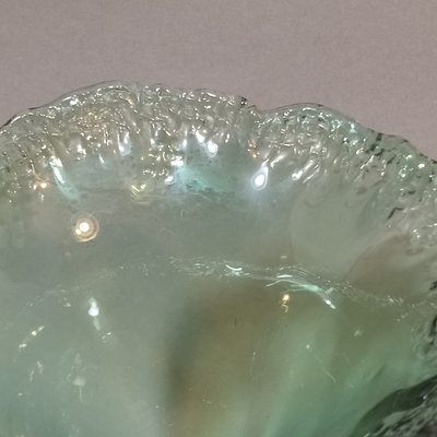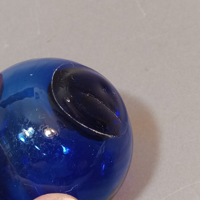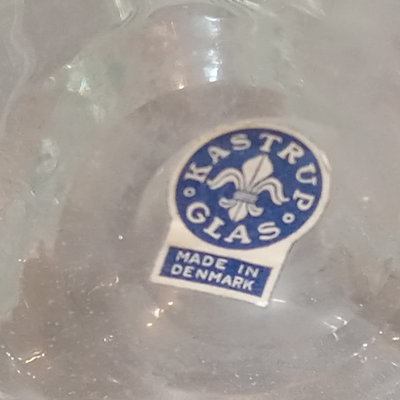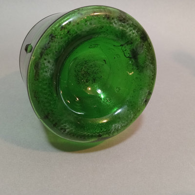 Green bottle, 7.5h. Bud vase with tulip neck, 7.5h. Kastrup Glass decanter, made in Denmark, 7.5h. Hand blown glass balls, 2d. 5 pieces.