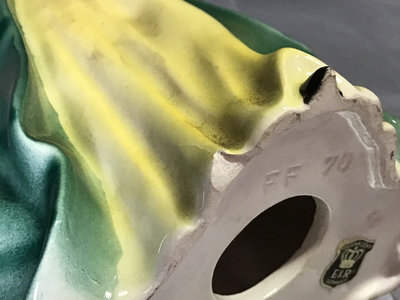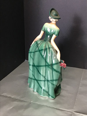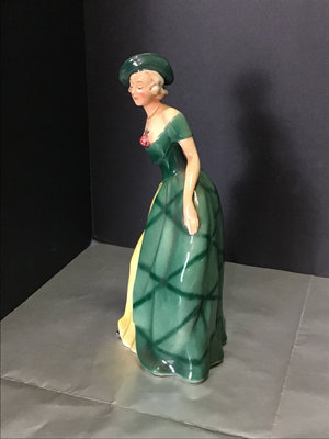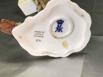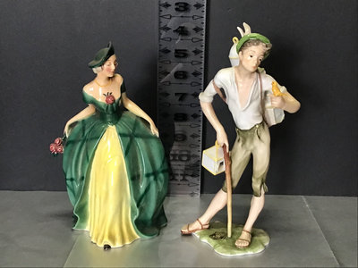 Golden Crown E&R FF70 lady in green, small chip on skirt, 8h, and no. 387 boy with birdcages, 9h. Made in Western Germany. 2 pieces.