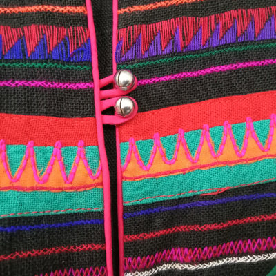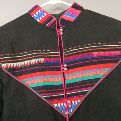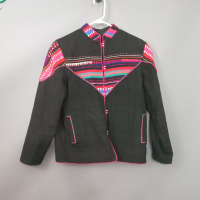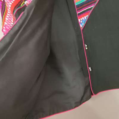 Vintage handmade jacket, possibly from Thailand, reversible to all black, 25in collar to hem, 21in pit to pit flat. 1 piece.