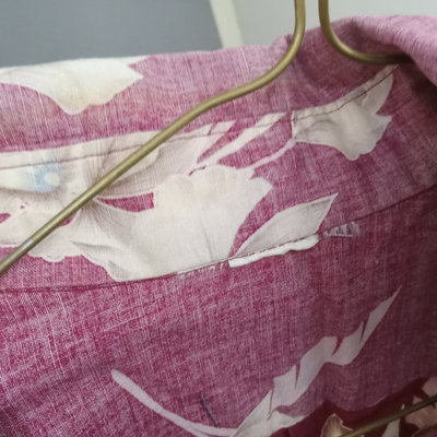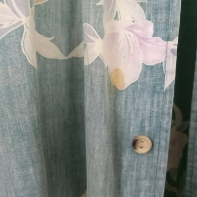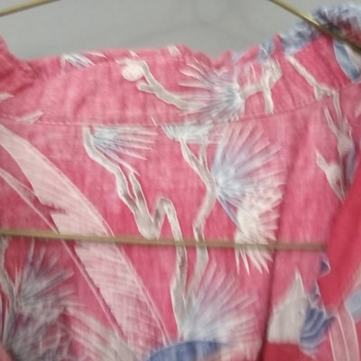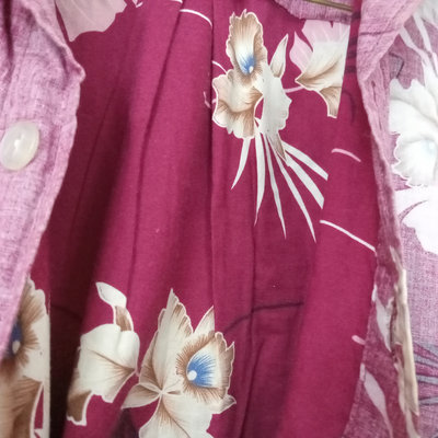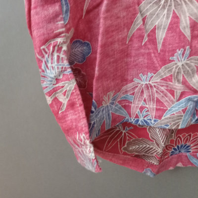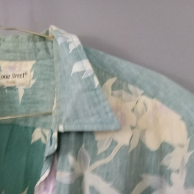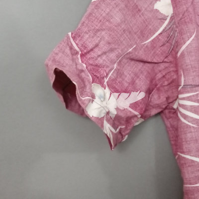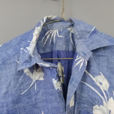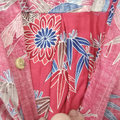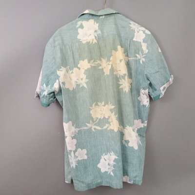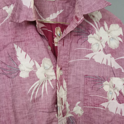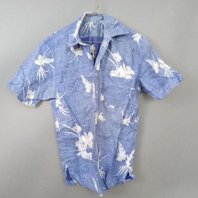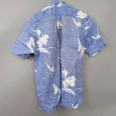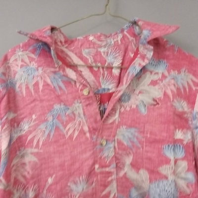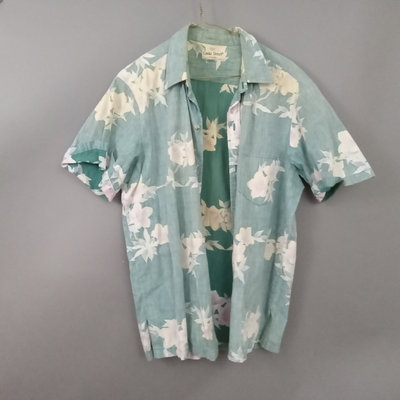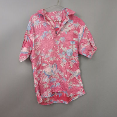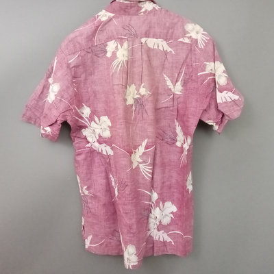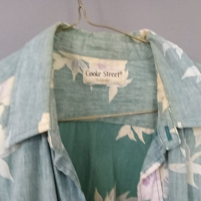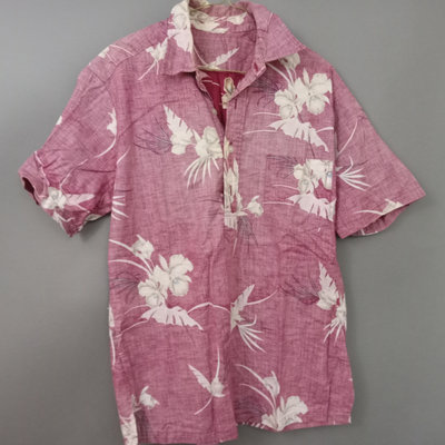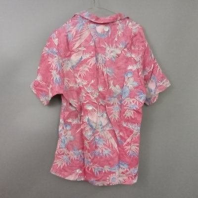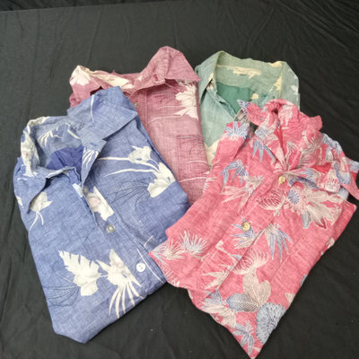 Vintage short sleeve Hawaiian shirts, 1/4 button front shirts with tags removed on all 3. Darker red with flowers 30in collar to hem, 22in pit to pit flat. Red with birds 29in collar to hem, 21in pit to pit flat. Blue 28in collar to hem, 20in pit to pit flat. Green full front button from Cooke Street Honolulu, note staining, 30in collar to hem, 23.5in pit to pit flat. 4 pieces.