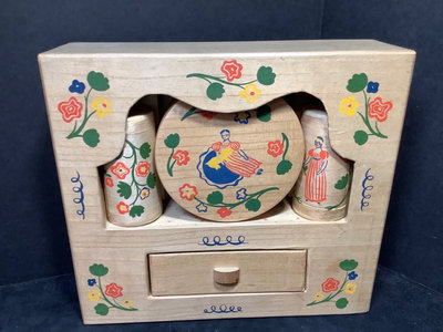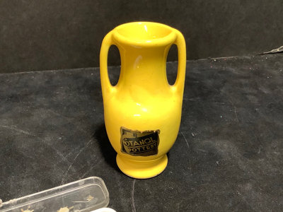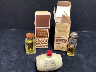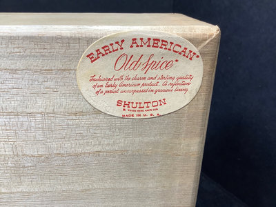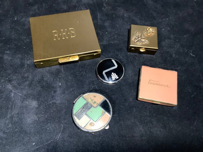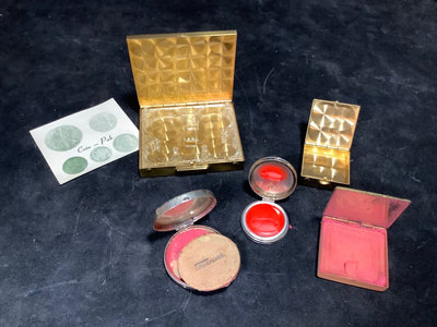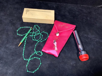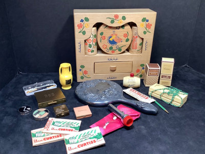 Early American Old Spice collection, soap is missing from drawer, all else seems intact. Mininflash light in satin bag. Metal cosmetics, pill, and coin cases. Mini dog/cat pen set. Mini yellow Stahl vase. Sampler perfume and Eau de Toilette. Pencil on chain clip. Heavy quadruple plate hand mirror. And more. 18 pieces.