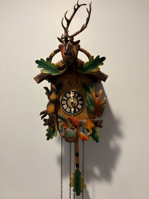 The cockoo clock is a classic handmade wooden craft of Germany . Decorated with hunter theme , rifle, bag and kills displayed .