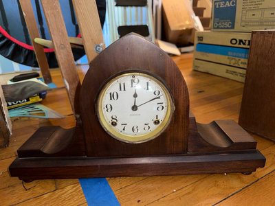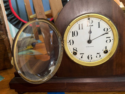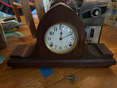 A vintage Ingraham wooden mantel clock with an arched top, glass-front bezel, and brass ring around a white dial. The clock exposes its internal gears and winding mechanism, with a separate winding key and a detachable wooden back panel. Untested.