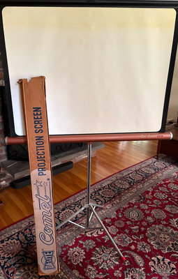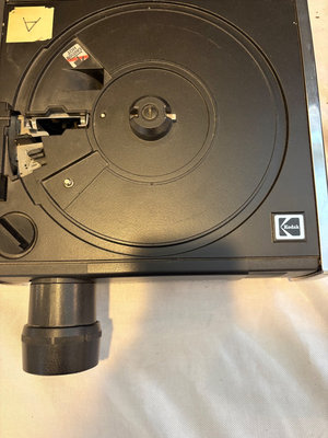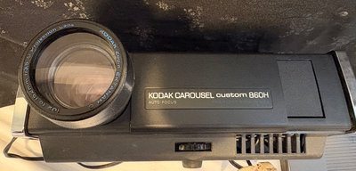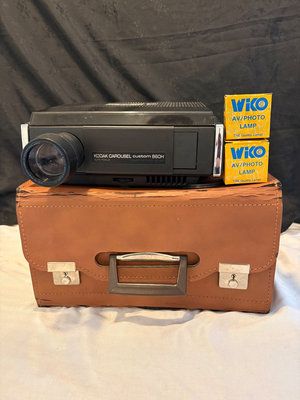 The Kodak 860H portable slide projector features autofocus and a stack loader for organizing and displaying slides. The “H” in the model indicates high-efficiency lamp. This lot does not include a carousel. Does have 2 extra lamps. Tested. 40” screen included in lot.