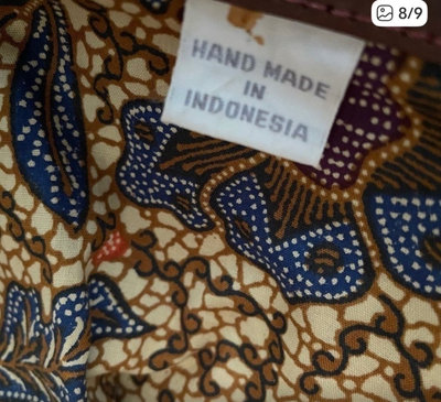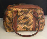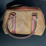 Herringbone pattern woven wicker and leather shoulder bag handmade in Indonesia . Has pretty batik fabric lining , inner zippered pocket, with leather bottom . 11” long, 5.5” wide.