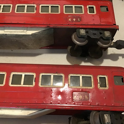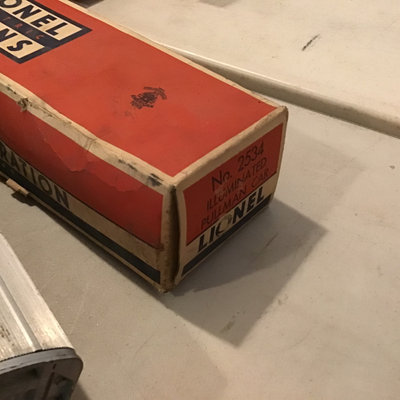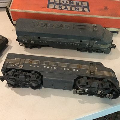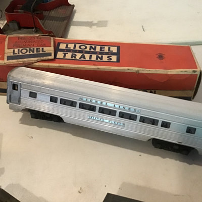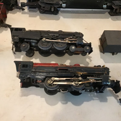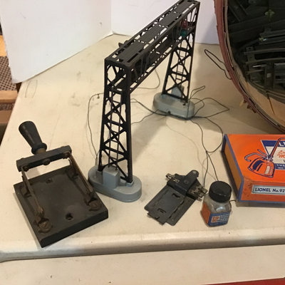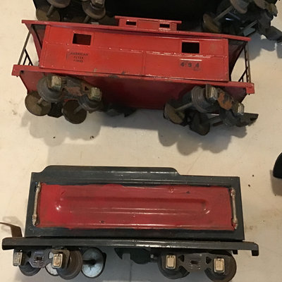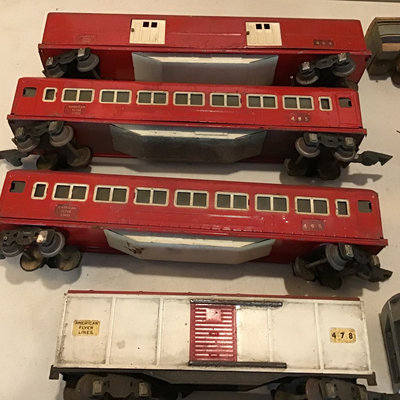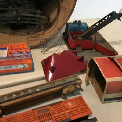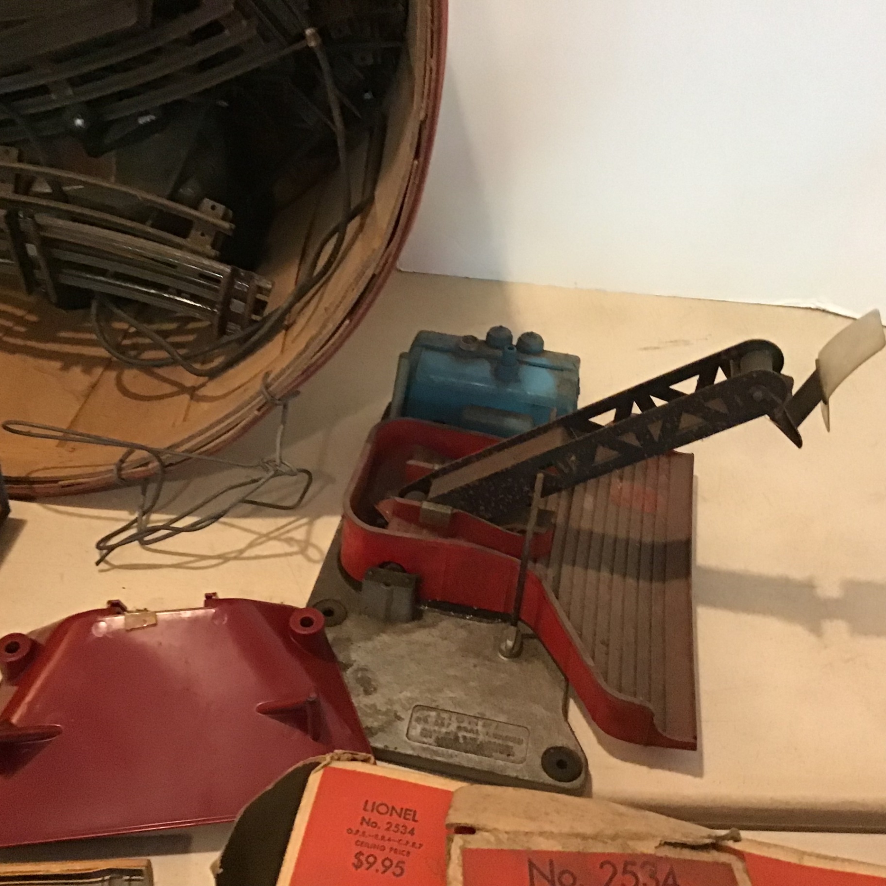 Well-loved metal Lionel trains, includes bushel of track and accessories. Several have boxes, varied condition. Dusty from basement track setup. 15 plus pieces.