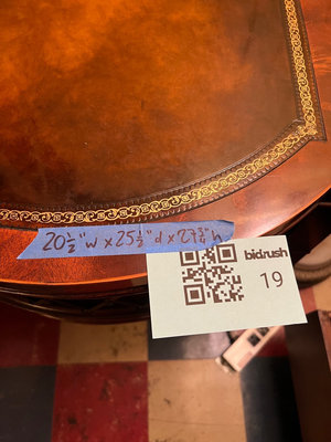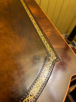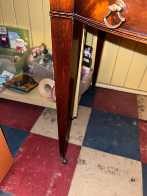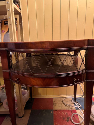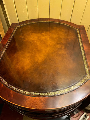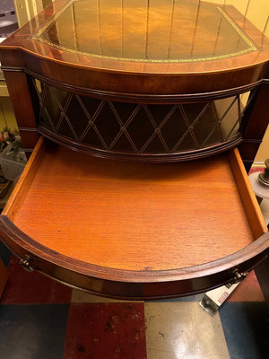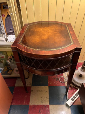 A vintage mahogany side table with a leather-inlaid top bordered by a gold-tooled trim, a curved front drawer with brass pulls, and a decorative diamond-pattern metal lattice on the front between square legs; includes a lower curved panel and open storage area beneath. **LOCATED IN BASEMENT, BRING HELP TO MOVE