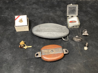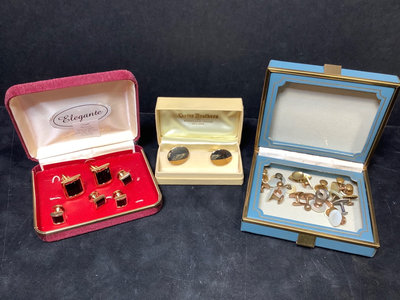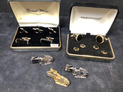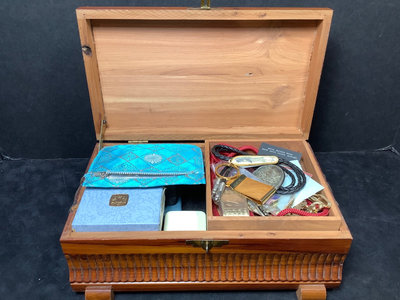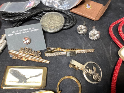 Wood box with pull out tray, 11.75x6.25x4.25. Bolos, tie tacks and clips, belt buckles, cufflinks and button sets, and more from Hickok USA, Mercury Industries, more. 35 plus pieces.