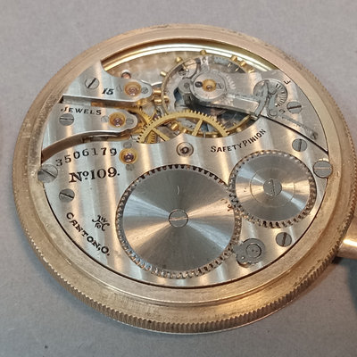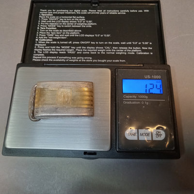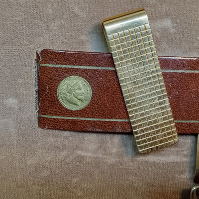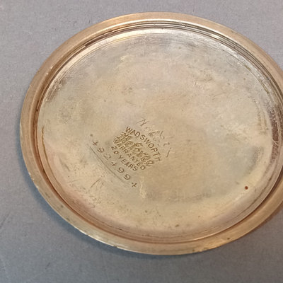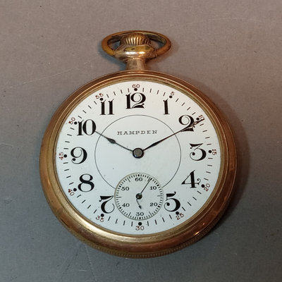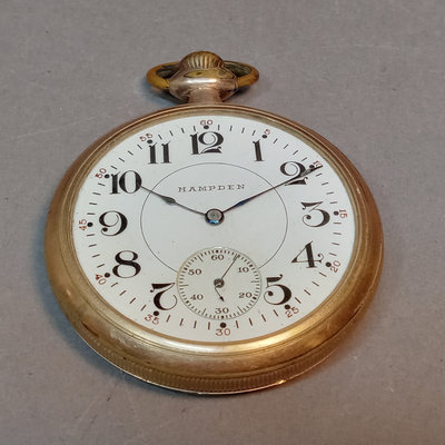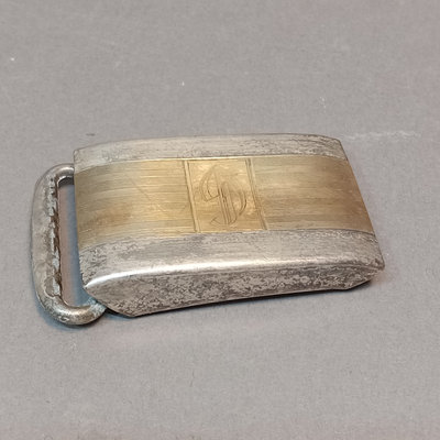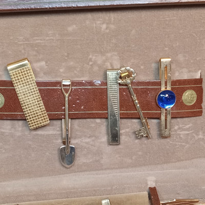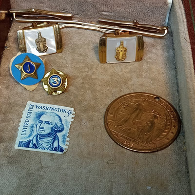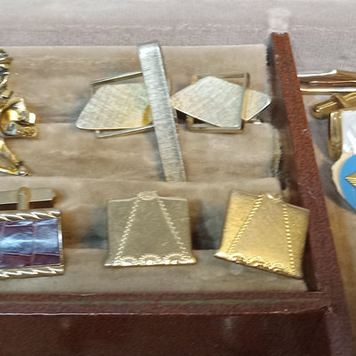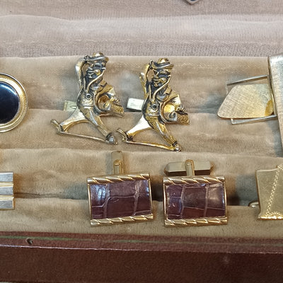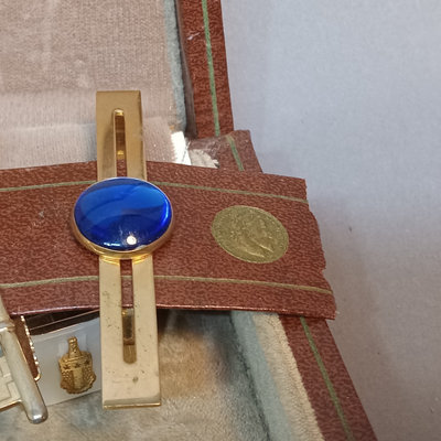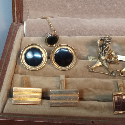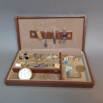 Hickok USA sterling and 10K belt buckle with "D" engraved on it, 12.4dwt. Hampden No. 109 serial no. 3506179 pocket watch, no glass on face, Wadsworth Riforge case no. 4924994. Vintage cufflinks, tie tacks, and more from Spiedel, Anson, Swank, Hickok. Leather case to hold it all, needs repair. 20 plus pieces.