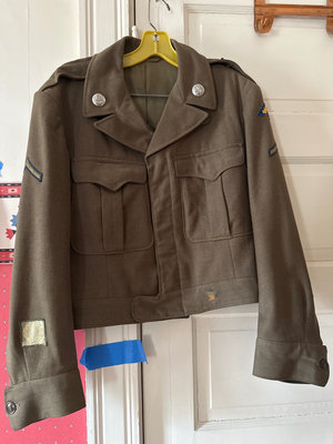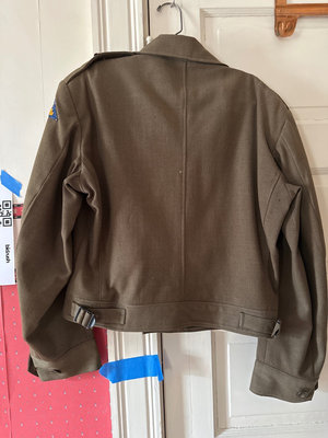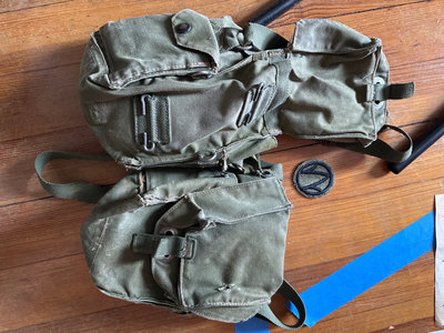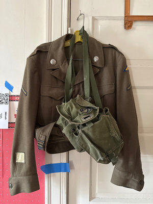 Brown military-style jacket featuring epaulettes, front flap pockets and insignia, paired with an olive-green canvas field bag and a small pouch with straps and buckles.