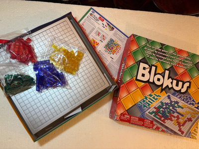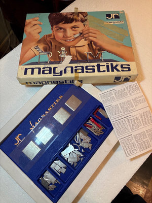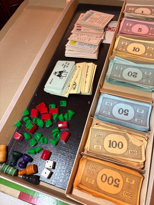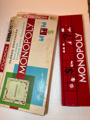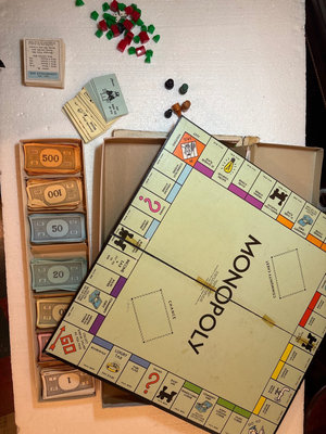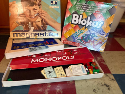 A collection of vintage board games and related components, including multiple Monopoly sets with play money and boxes, a Blokus game, a Magnastiks magnetic construction set with tiles and accessories, and various game pieces, cards, dice, and instruction sheets. **BRING OWN PACKING MATERIALS, NOT TESTED FOR COMPLETENESS.