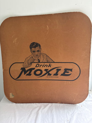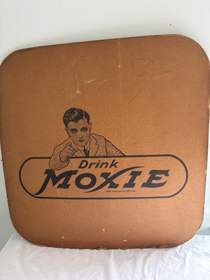 Large lapboard advertisement sign for Moxie, (2 sided) It is made of cardboard and These lapboards were produced in the 1930s and distributed to railroads for passengers to use as a portable table. It is square, 23” x 23”