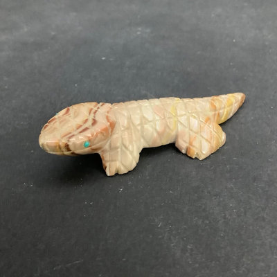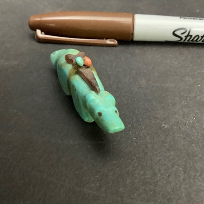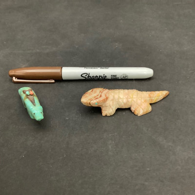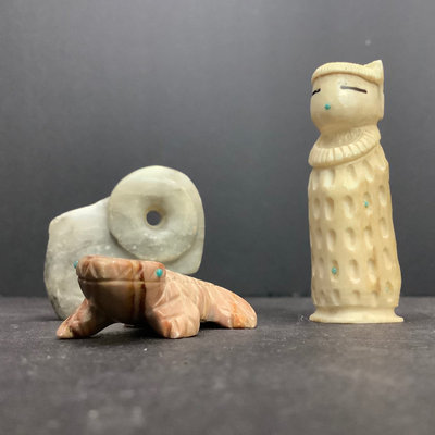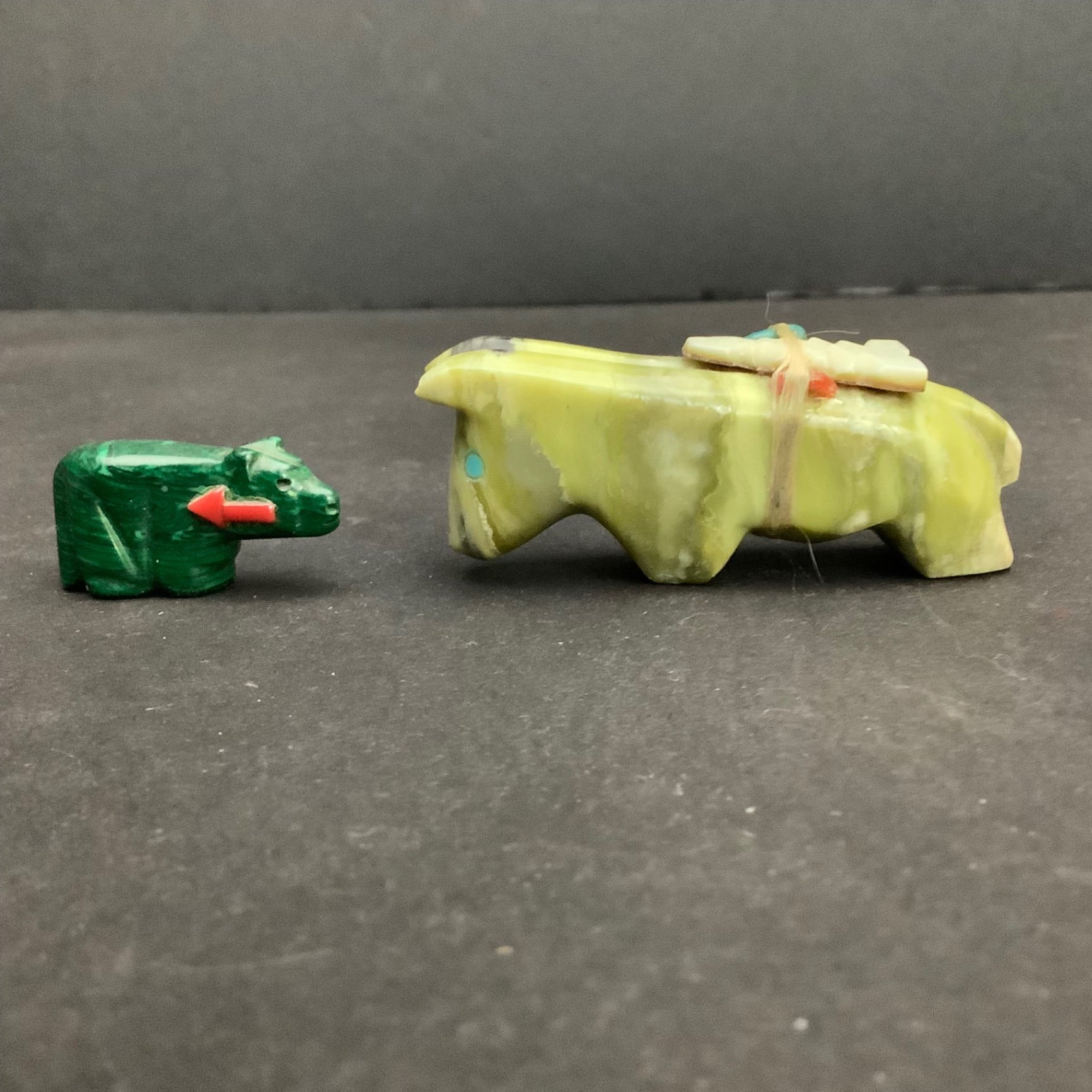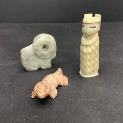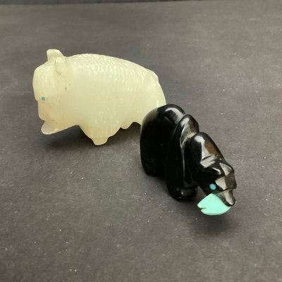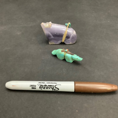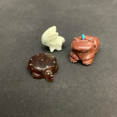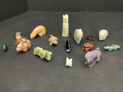 Carved stone Zuni fetishes from various artists. Corn maiden signed "G.W." for Garrick Weeka. Ram fetish signed "GL" for Gilbert Lonjose. Green hippo, platypus and bear with tied on stones by Andy and Roberta Abeita. Zuni frog signed H with dot above. Small amber turtle, unsigned. And more. Tallest piece, 3h, smallest .75h. 15 pieces.