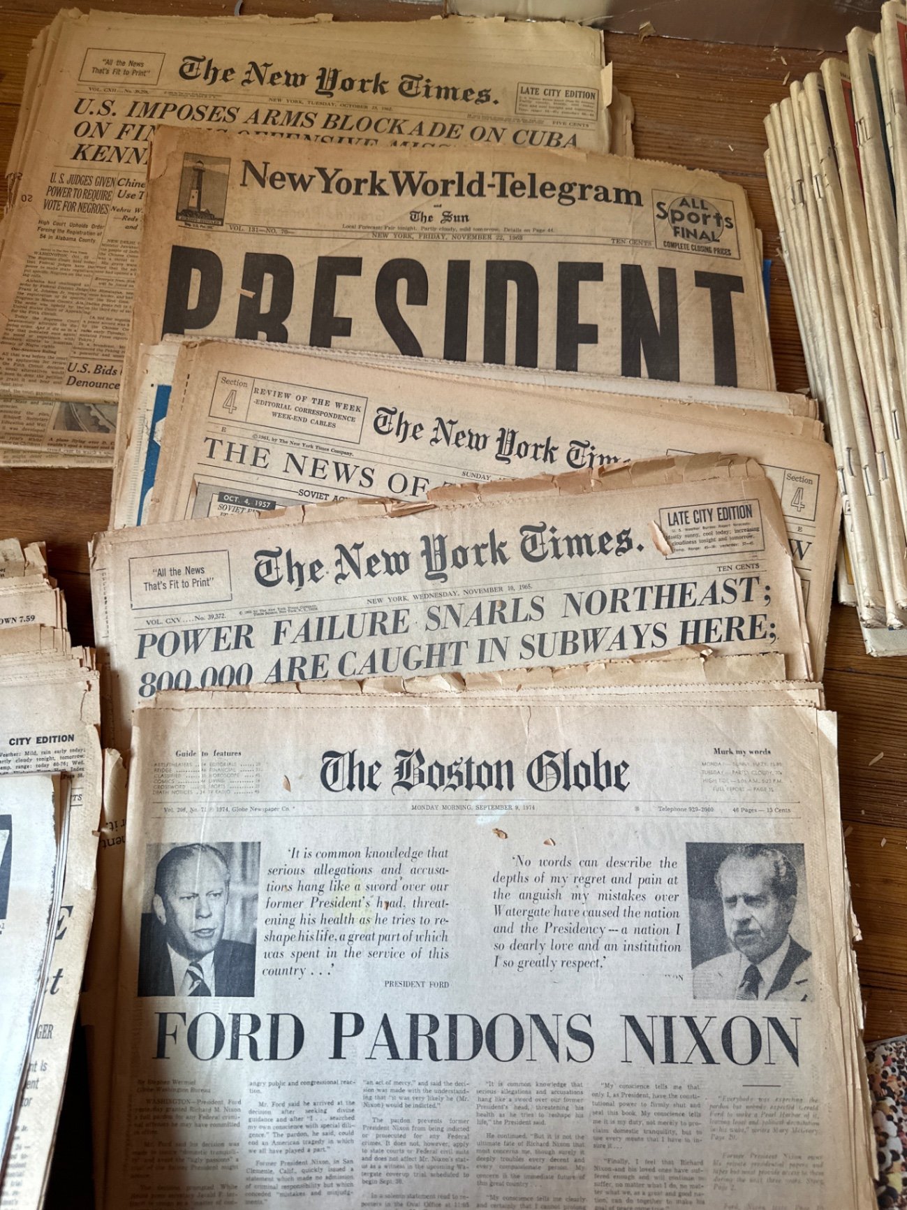 A collection of vintage newspapers from major outlets (The New York Times, The Boston Globe, New York Daily News, The New York Mirror, The New York Independent, Boston Evening Globe) and a LIFE Special Edition Woodstock Music Festival magazine.