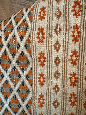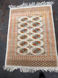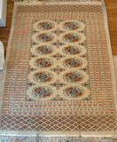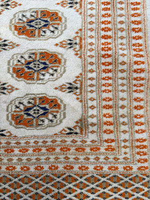 Bokhara 53” x 40” tribal rug made in Pakistan . Has geometric patterns with main color cream , rust , taupe and blue accents . No label . Looks good even on wrong side .