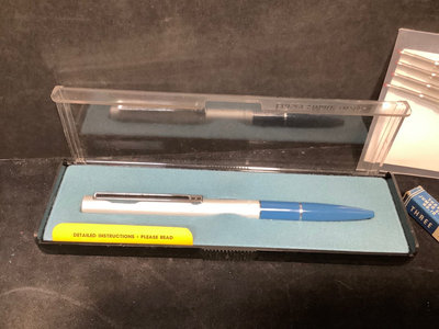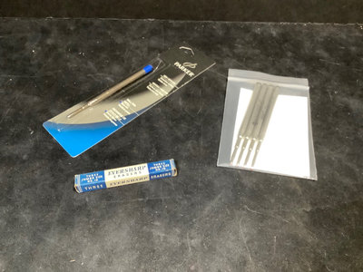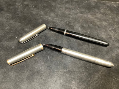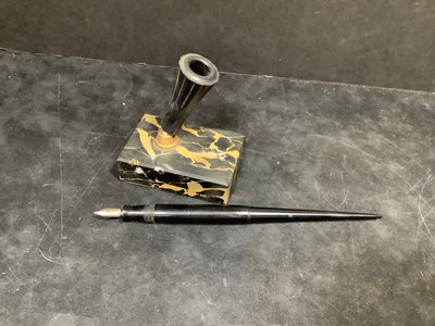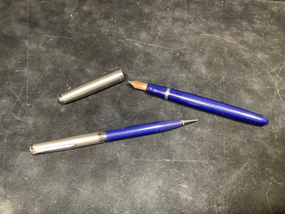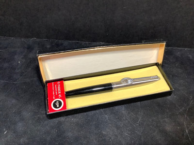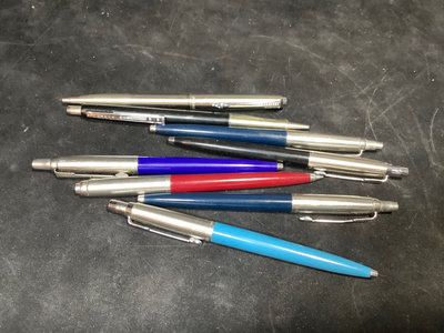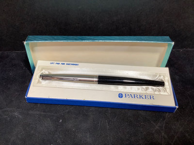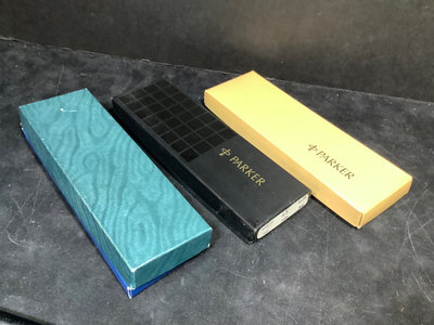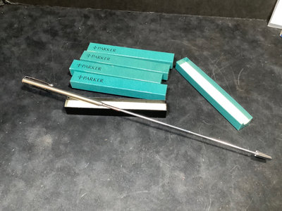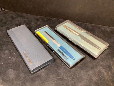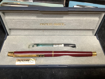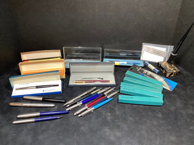 Parker and Paper Mate pens, some in original boxes. Two fountain pens. One fountain pen and mechanical pencil set. Parker Duofold Fountain pen with 14k nib in marble paperweight holder. Retractable pounters, new in box. And more. 20 plus pieces.