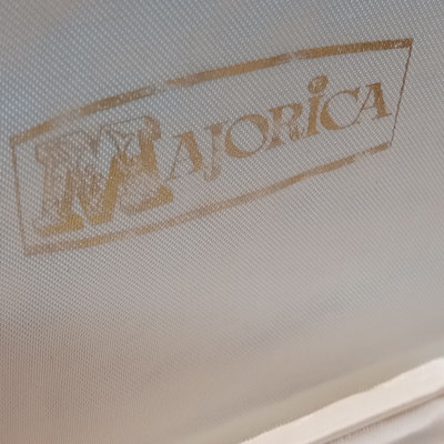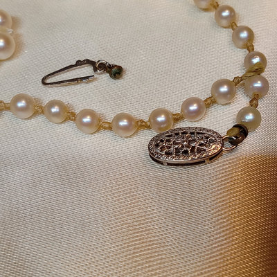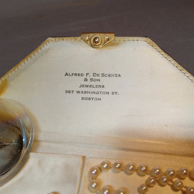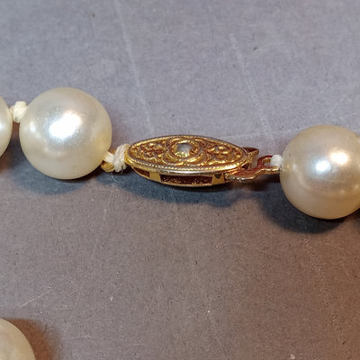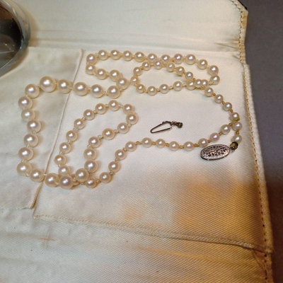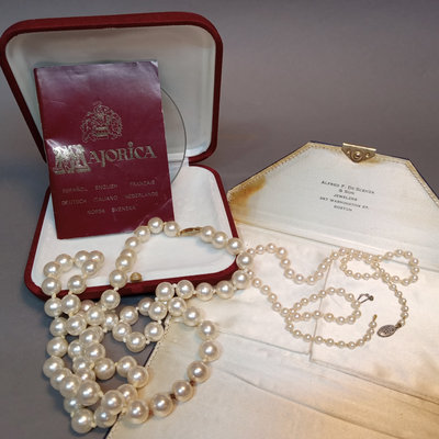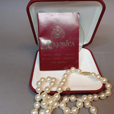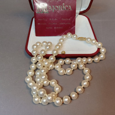 Majorica pearls 30in 9.7mm necklace in original box, noted never worn by owner. Graduated strand of pearls from De Scenza Jewelers, 14kt white gold clasp needs to be re-attached on one end, in original jeweler's pouch. 2 pieces.