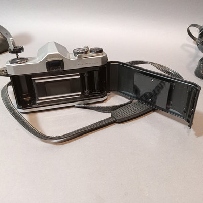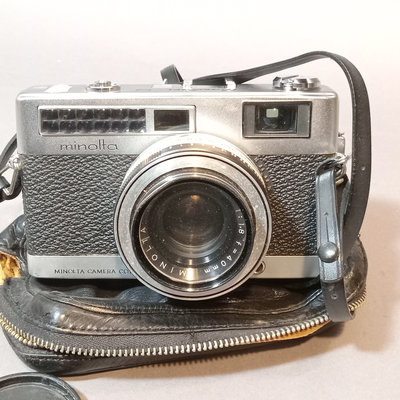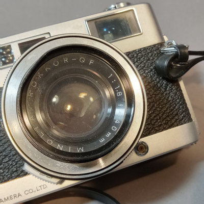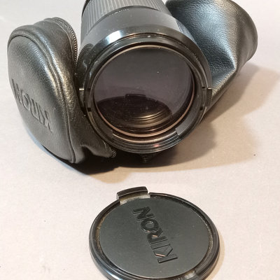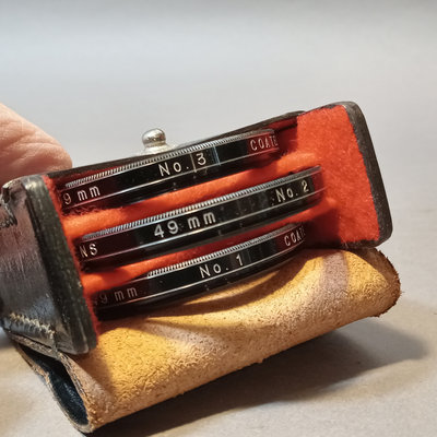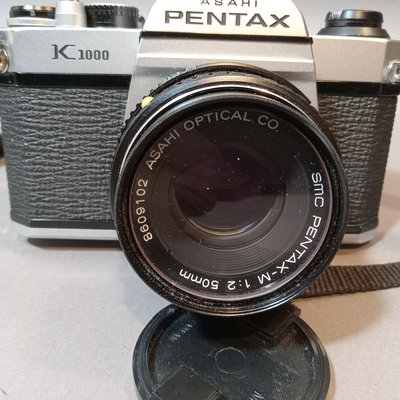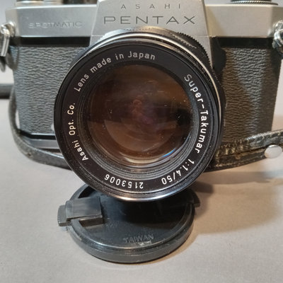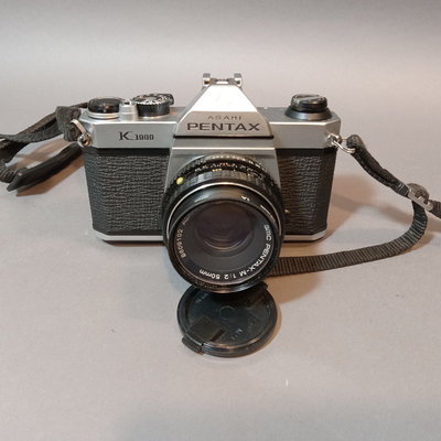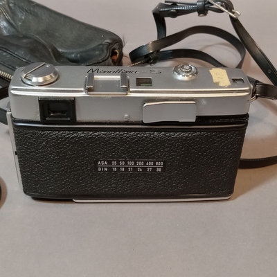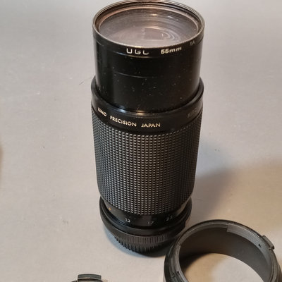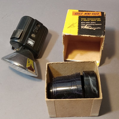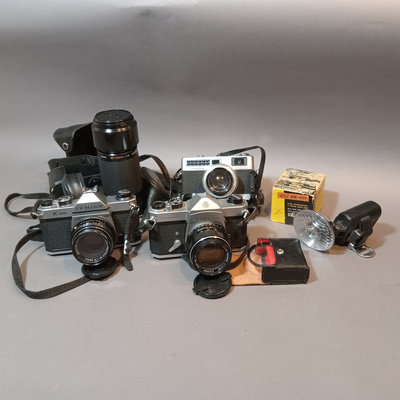 Asahi Pentax Spotmatic no.23102 body, needs optics cleaned, with attached Super-Takumar 1:1.4/50 lens and leather strap. Asahi Pentax K1000 no. 8233139 body with leather attached UGC 49mm lens, leather case, and nylon strap. Minolta Minoltina - S body with Minolta Rokkor-QF 1:1.8 f=40mm lens, leather case and strap. Shutter/film advance working for all SLR bodies, untested with film. Kiron 80-200mm lens with hood and 55mm filter attached, leather case. Small leather case with three coated 49mm filters, Nos 1, 2, 3. Cat Eye lamp, untested. Guild Mini-Vuer in box. 10 plus pieces.