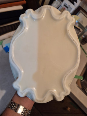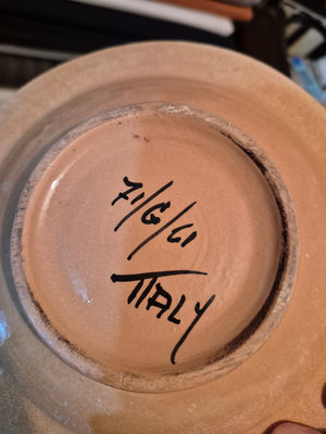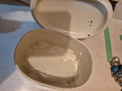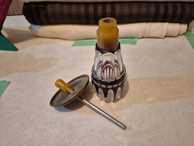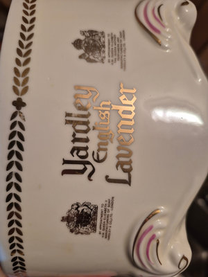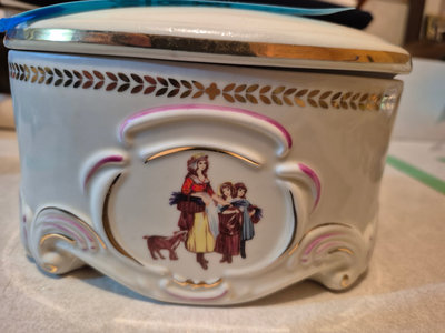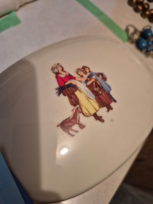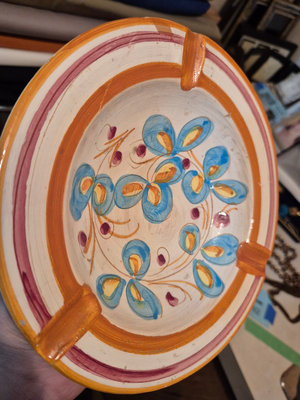 A collection of vintage decorative items including a bottle-shaped perfume dispenser (as is as found), a ceramic lidded box with a painted scene, and a round ashtray featuring a blue, yellow, and red floral motif. ** BRING OWN PACKING MATERIALS