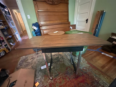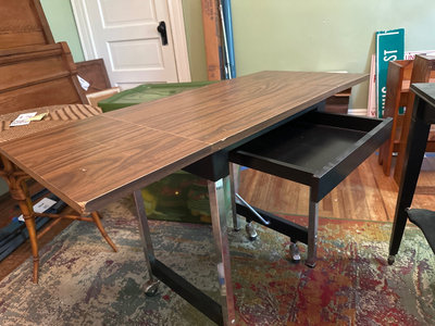 Vintage desk or work table with extendable desk top, a black pull-out drawer mounted on a metal frame with casters.