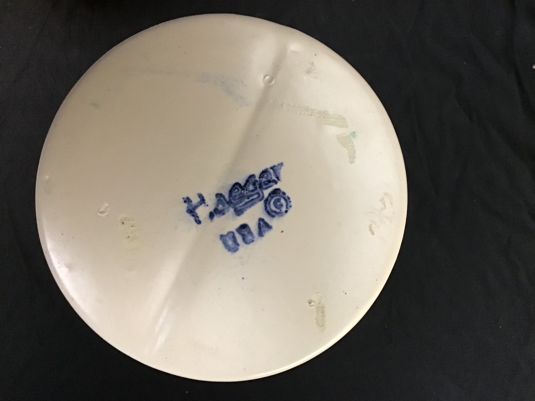 Vintage USA pottery. White Haeger 9h. Large green 8.5d x 4.5h. Light green 2-handle, 5h. Green bud vase 5h. Roseville planter 11.5x7x3, may have small chips along rim from age and use. 5 pieces.