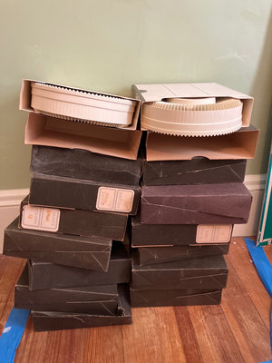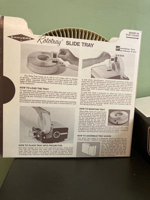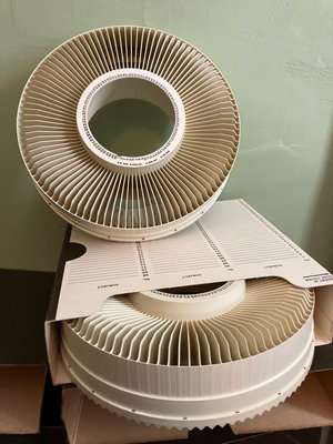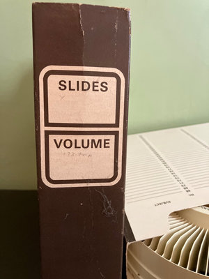 A collection of vintage Rototray slide trays, circular rotary slide components, and multiple slide storage boxes labeled SLIDES and VOLUME for organizing photographic slides.