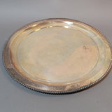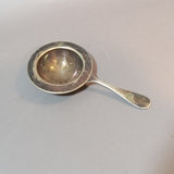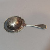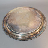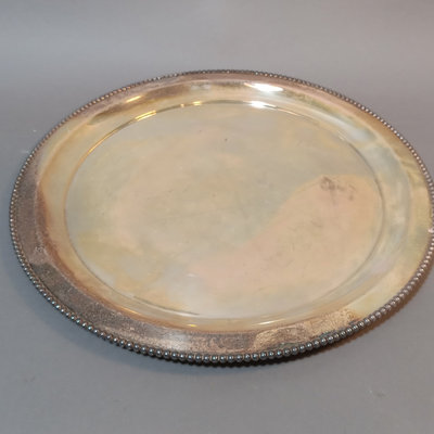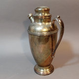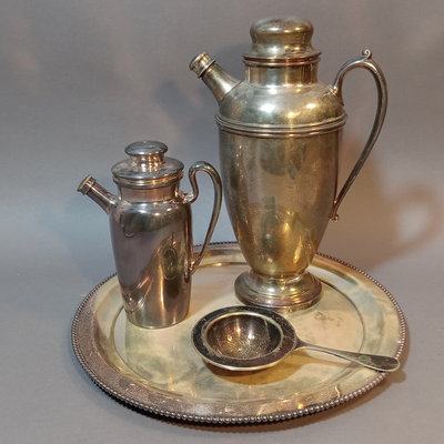 Vintage silverplate. MIBI Co. no. 00344 12d tray, made in USA. Cresent Manufacturing Co. Silverware, no. 8854 shaker, 11h. SF Co. no. 500 shaker, dent on one side, 7h. Hand-held strainer, no marks. 4 pieces.