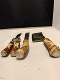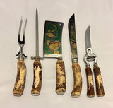 This set includes a carving fork, a sharpening steel, a cleaver, carving knife and poultry shears. The handles are crafted from genuine stag horn, a common material used in high quality German cutlery . The blades on the cleaver and carving knife are etched decorative scenes of turkey and other wildlife. .