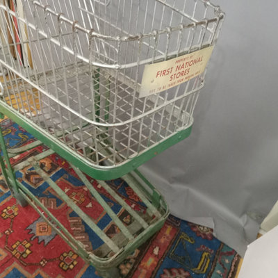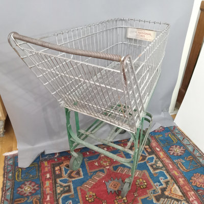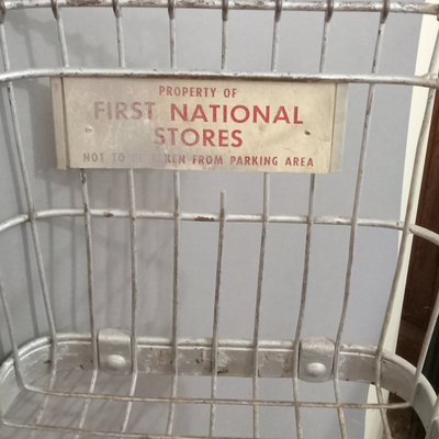 First National Stores steel shopping cart, a workhorse and holder of things for a number of years. 18x31x38. Heavy, bring appropriate help and vehicle to pickup. 1 piece.