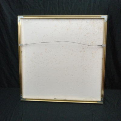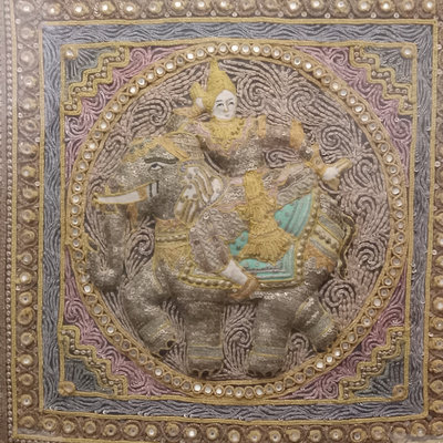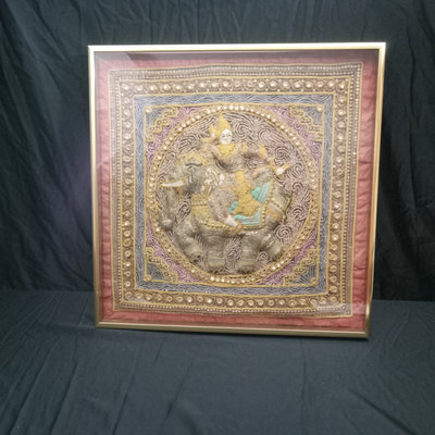 Handmade embellished textile, heavily beaded and sequinned, framed in a shadow box. Foxing on back board. 22.25x2x22.25. 1 piece.
