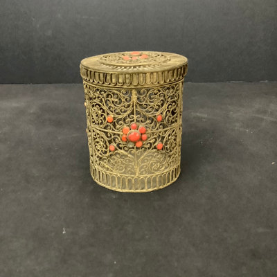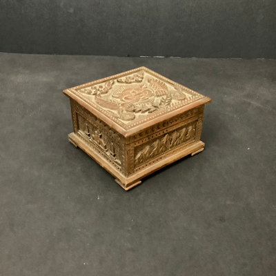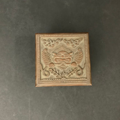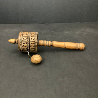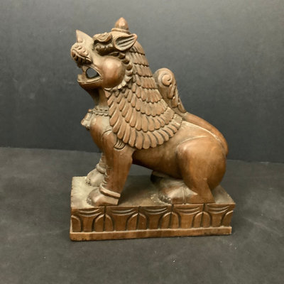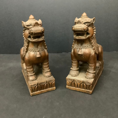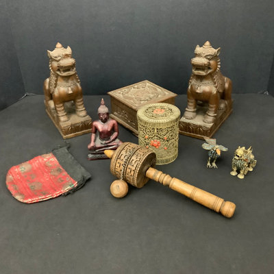 Pair hand carved wooden Burmese temple lion bookends, small chip on one face, 2.5x 5.75x7.5. Carved box, 4.25sq x2.5h. Brass canister and tiny figurines, 2.5h. Tibetan prayer wheel 9in long. Composite Buddha 4.5h. 8 pieces.