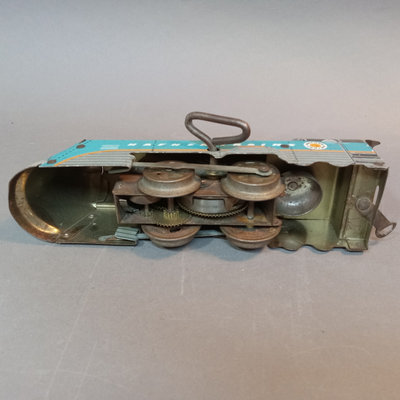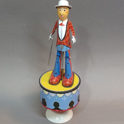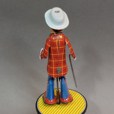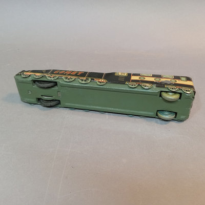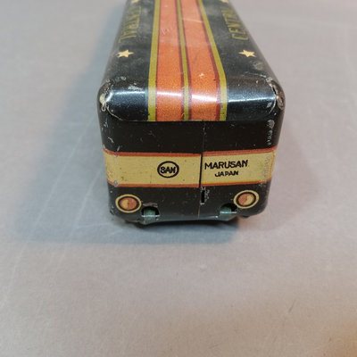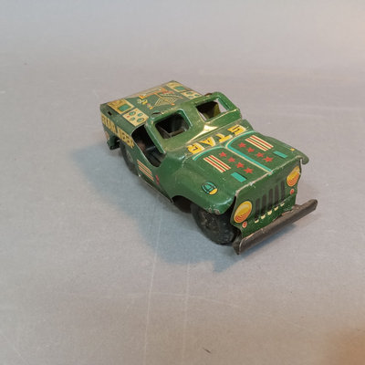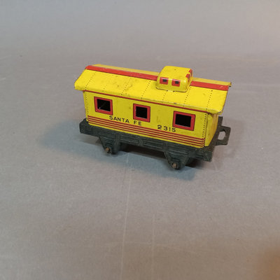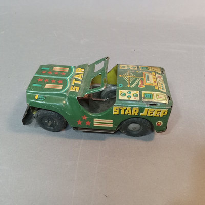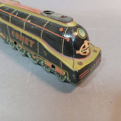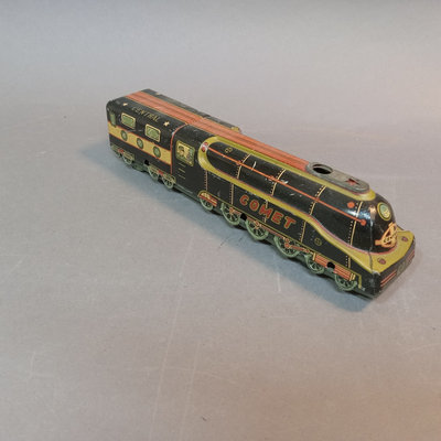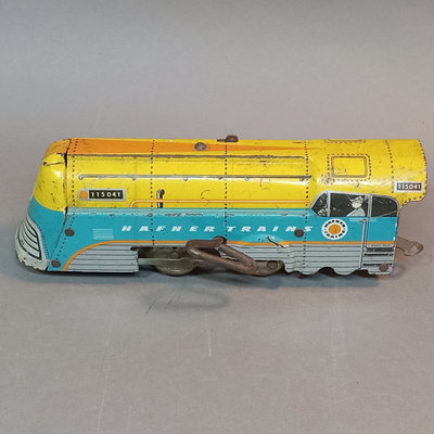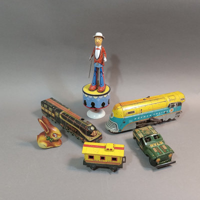 Marusan Japan Comet. Hafner Trains no. 115041 wind up train. Wind up tap dancer, newer. Lehmann of Germany Hip Hop Bunny, missing flower on nose, made in West Germany. Santa Fe train car with plastic base, made in Japan. Tin Jeep with plastic wheels. All scuffed/scratched, consistent with age and use. 6 pieces.