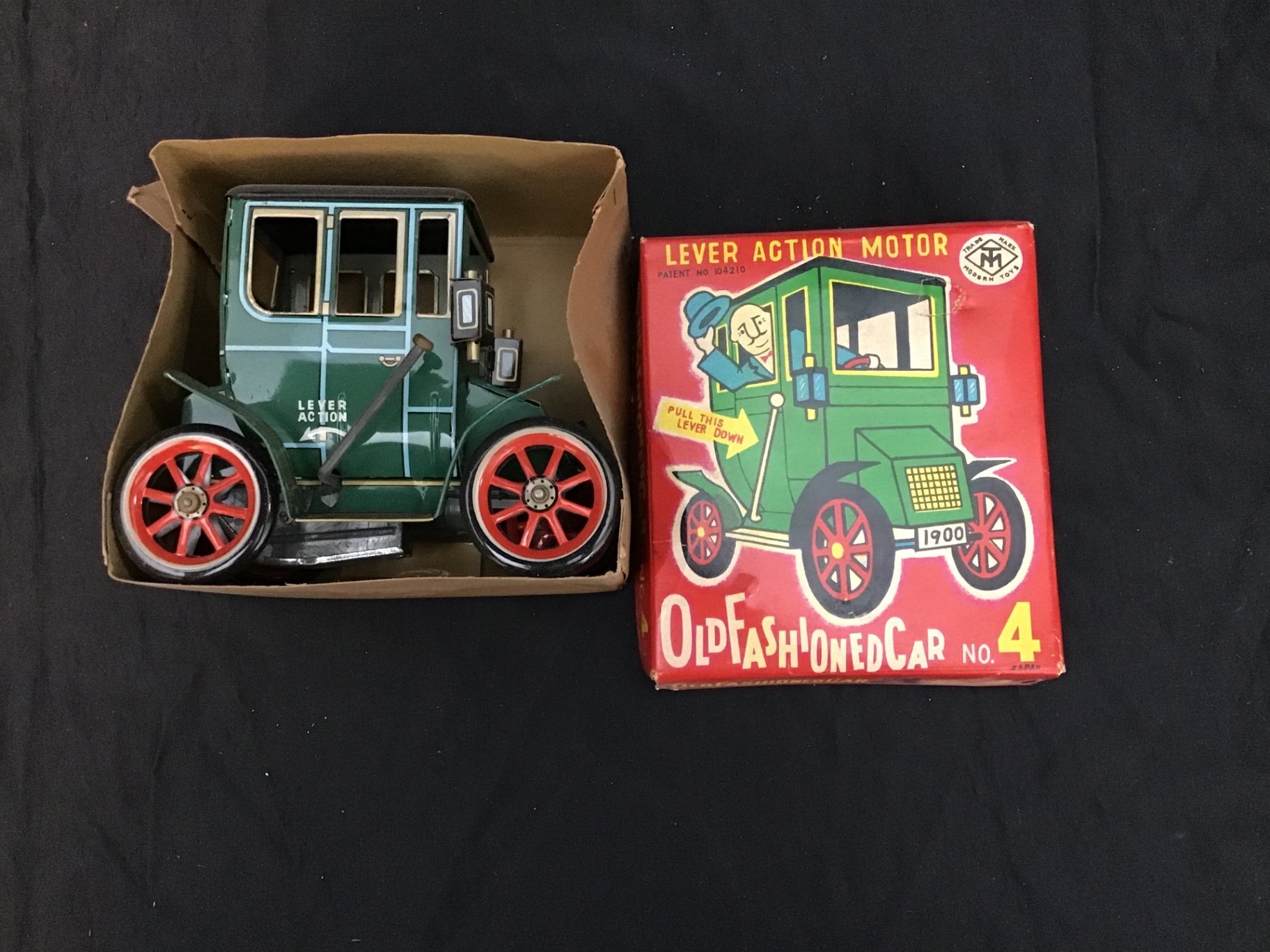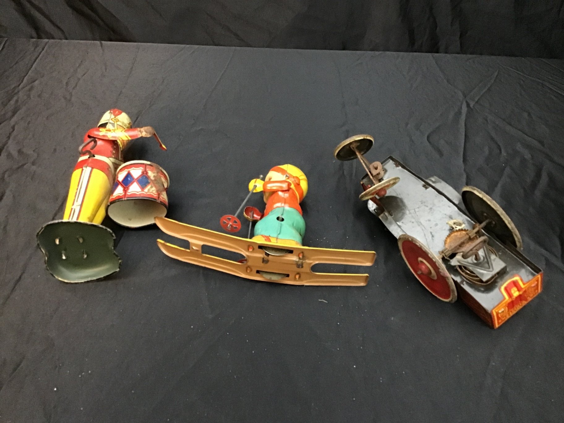 1950s old fashioned car, new in original box. All American Fife whistles. Funny Fire Fighters truck. MAR Toys wind-up drummer, 9h. Wind-up skier, missing key, untested. 7 pieces.
