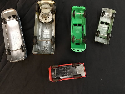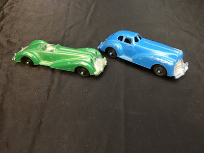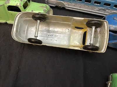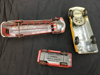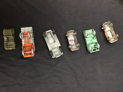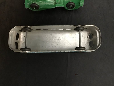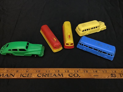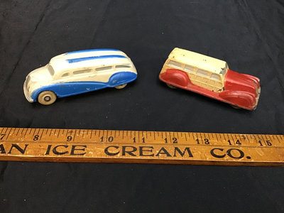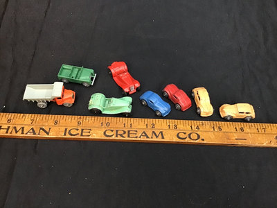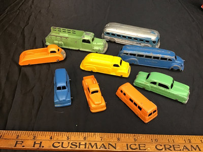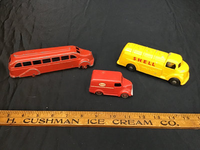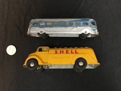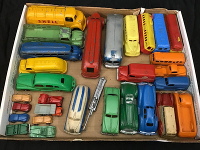 Vintage metal and plastic toy cars, trucks, busses, etc. Includes Londontoy windup Shell truck made in Canada. Manoil, A Renewal Product, Acme, Tootsietoy, Ideal, Metal Masters, all made in USA. Dinky Toys made in England. Two rubber cars. Pre-loved. 30. pieces.