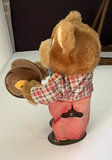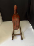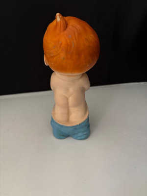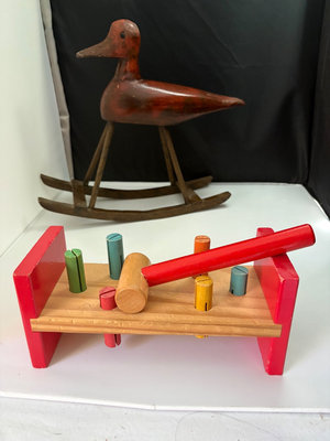 Primitive folk art handmade rocking duck toy, circa 1980s, Indonesia, vintage toddler pounding toy, A vintage rubber squeaky toy of a boy with red hair and his pants falling down. These types of toys were popular in the mid-20th century . This specific style of toy is often associated with manufacturers from West Germany or France, such as Laflex. A Schylling Streamline Train chrome-plated wind-up tin 3 car toy . This replica is modeled after the real-life "Flying Yankee" diesel streamliner train. About 13” long and no wind up key . Chadwick animal dominoes , 28 pc. vintage wind-up toy bear that plays the cymbals. This specific toy is part of the "Yesterday's Favorites" collection by the Russ Berrie Company, likely in the 1980s. These toys considered nostalgic collectibles . Finally a classic tin spin top toy with a vehicle pattern.