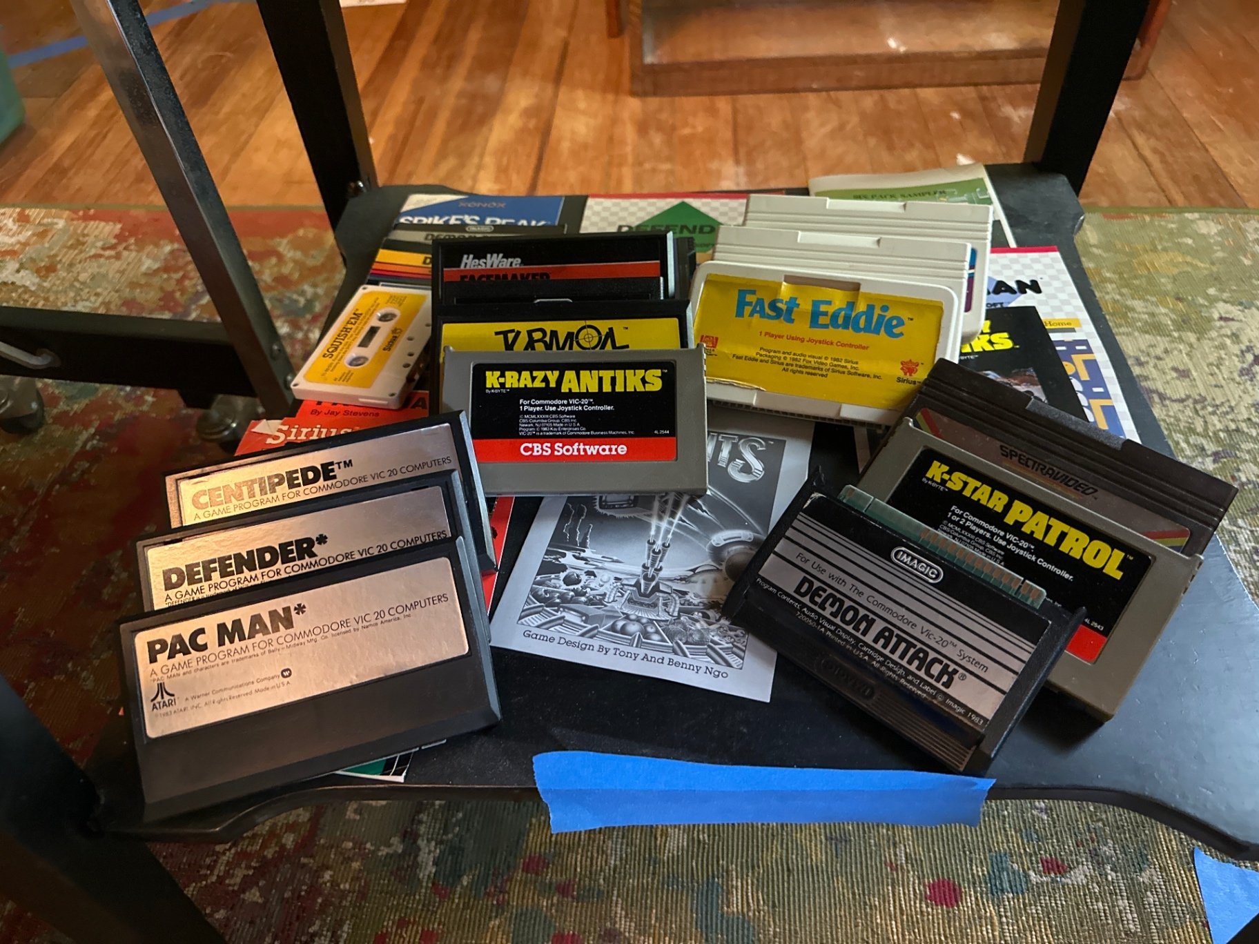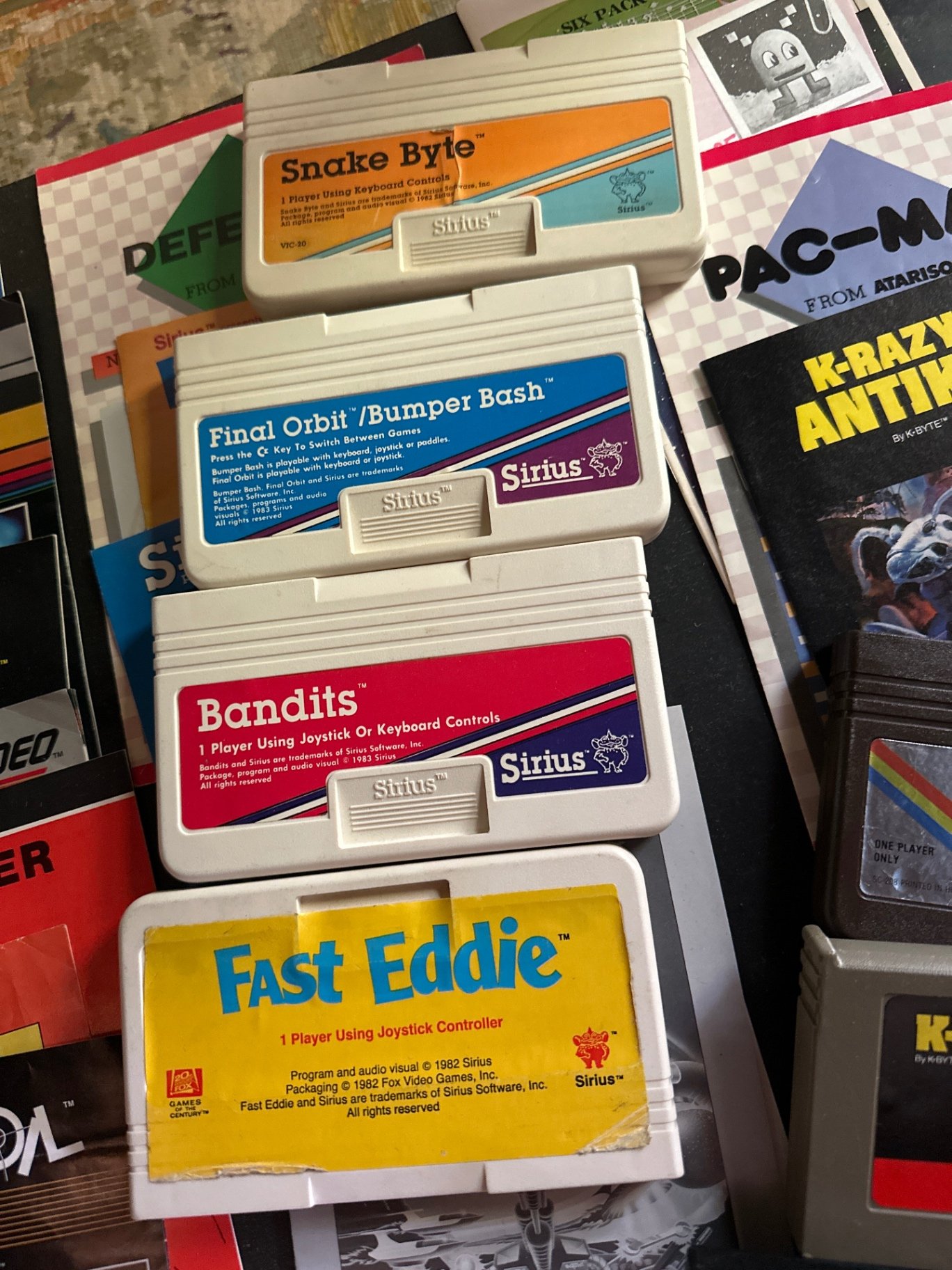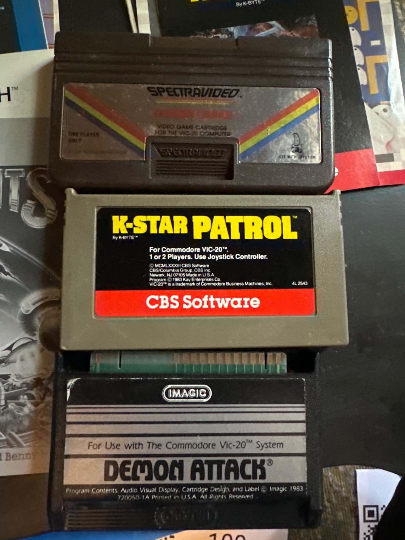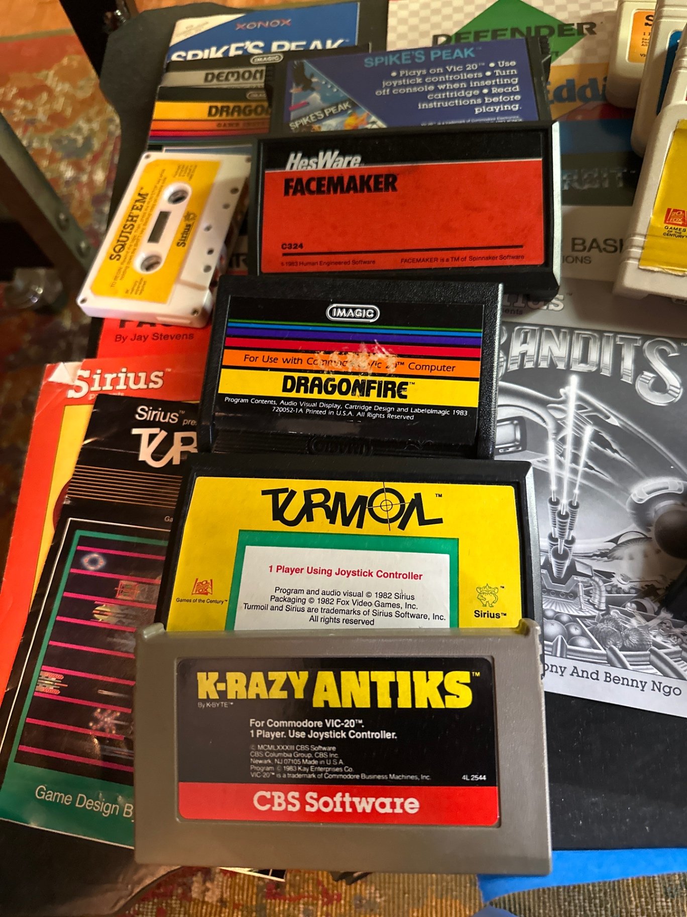 A mixed assortment of 1980s video game cartridges and related materials for Commodore VIC-20 and Atari 2600 systems, featuring titles such as Centipede, Defender, Pac-Man, Dragonfire, Demon Attack, K‑Razy Antiks, Fast Eddie, Turmoil, Bandits, Snake Byte, Final Orbit/Bumper Bash, and K‑Star Patrol, from publishers including Sirius Software, CBS Software, Imagic, and SSpectravideo.Untested.